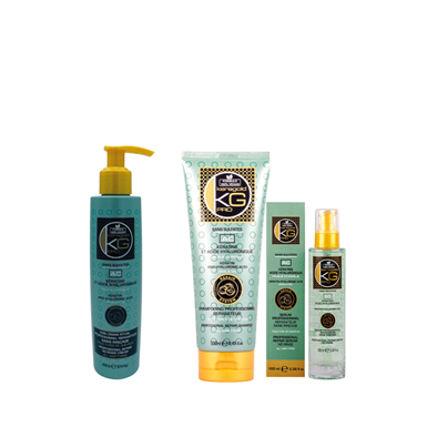 De Keragold-lijn, speciaal ontwikkeld voor alle haartypes, herstelt en voedt de punten en lengtes diepgaand. De revitaliserende werking voorkomt vroegtijdige veroudering van het haar en voegt zachtheid en glans toe zonder het haar te verzwaren.
