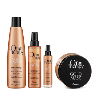 De goudkleurige microdeeltjes in de Oro Therapy producten geven het haar een uitzonderlijke glans en glans zonder het te verzwaren.