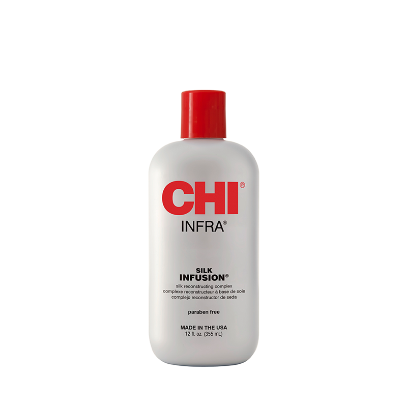 CHI INFRA Silk Infusion is een reconstructieve behandeling verrijkt met zijde-, tarwe- en sojaproteïnen die het haar revitaliseren en versterken. De lichtgewicht formule herstelt het haar in zijn gezondste staat met ongelooflijke zachtheid, handelbaarheid en glans. Deze alcoholvrije leave-in behandeling helpt pluis en statische elektriciteit onder controle te houden. Het is ontworpen om droogheid te herstellen, glans toe te voegen en het haar te beschermen tegen schade door de omgeving. Het voorziet elke streng van diep hydraterende ingrediënten om bestand te zijn tegen alle weersomstandigheden. Deze leave-in treatment helpt het haar te hydrateren en glad te maken terwijl het een gezonde hoofdhuid behoudt. Het kan gebruikt worden op alle haartypes en kan zelfs je huid hydrateren! Of je je haar nu steil maakt, krult of föhnt, CHI INFRA Silk Infusion helpt je haar te beschermen tegen hitteschade, kroes en springerig haar.