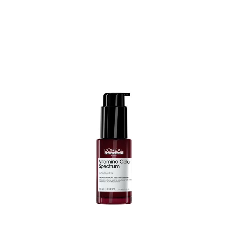 L’Oréal Professionnel Vitamino Color Spectrum Glass Shine Serum is een leave-in serum dat zorgt voor een direct glasglanseffect en resultaten tot wel 10 wasbeurten*. Het serum biedt bescherming tegen UV-schade, anti-frizz tot wel 72 uur** en hittebescherming tot 230°C*. Het serum bevat 5% alpha-silane, dat een beschermende laag op de haarvezels creëert wanneer het wordt geactiveerd door hitte. Voor langdurig stralende, gehydrateerde en gladde lokken. L’Oréal Professionnel Vitamino Color Spectrum Glass Shine Serum beschermt en behoudt je haarkleur, met een effect op de 5 kleurdimensies: intensieve glans, rijke kleursaturatie, optimaal contrast, neutralisatie van ongewenste reflecties en behoud van helderheid. Ook geschikt voor haar dat niet gekleurd is. * Instrumentele tests ** Instrumentele test bij gebruik van de volledige Vitamino Color Spectrum-lijn