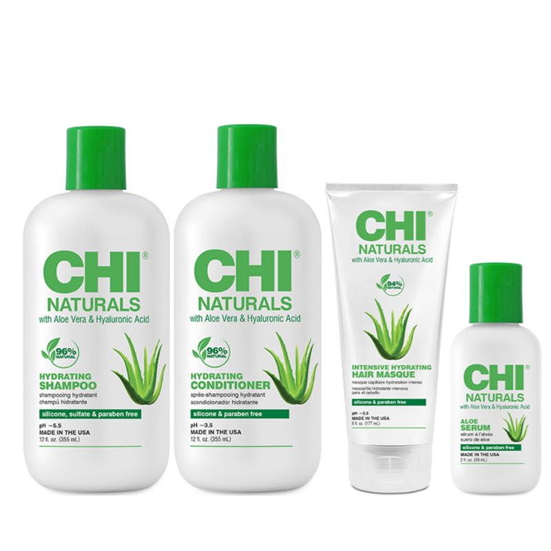 Formulée avec de l'Aloe Vera et de l'acide hyaluronique, la gamme CHI Naturals fournit une explosion d'hydratation et de nutrition pour fixer l'humidité et augmenter la brillance et la douceur des cheveux.