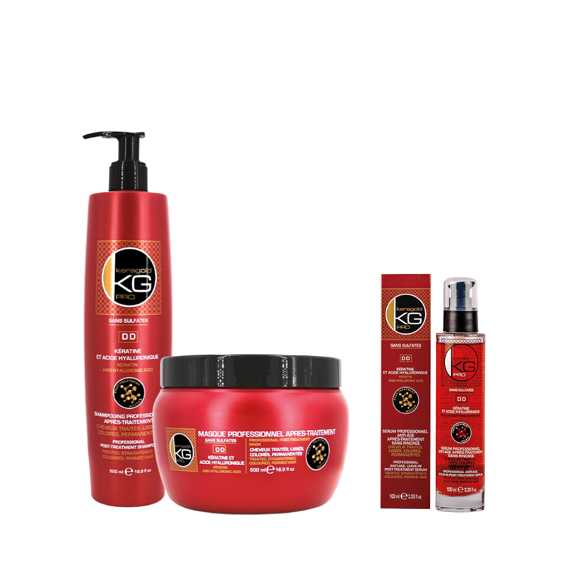 Cette routine Keragold à la kératine et à l’acide hyaluronique est idéale pour cheveux traités, lissés, colorés, permanentés.