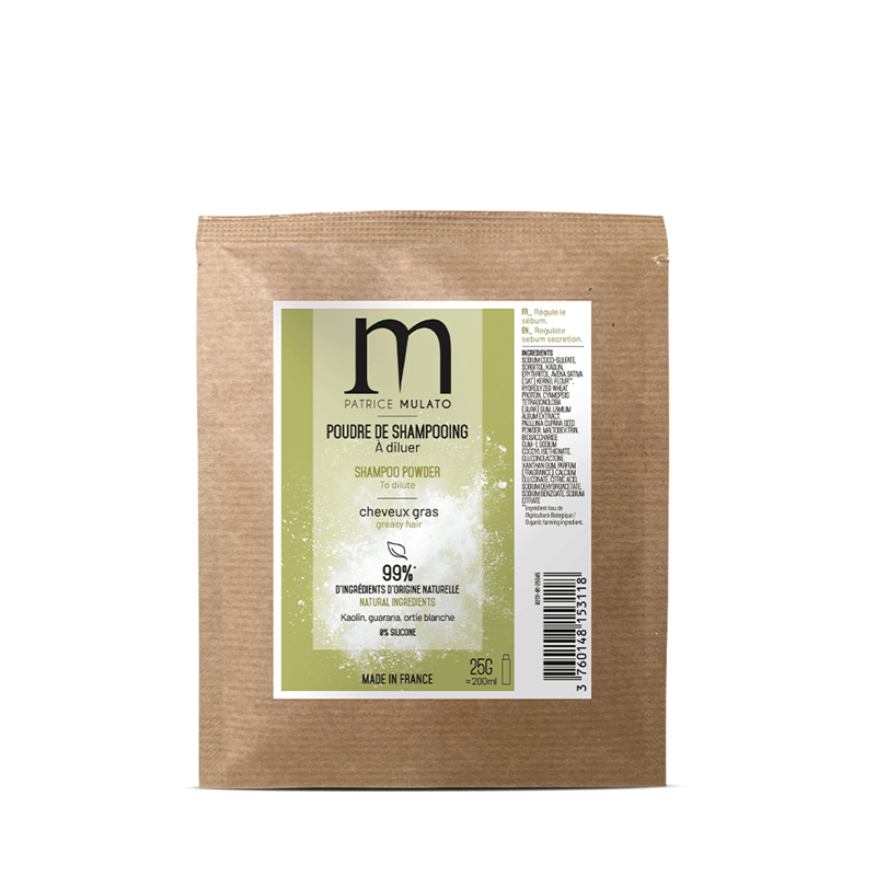 Shampooing en poudre à diluer pour cheveux gras.